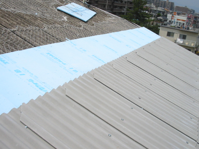 屋根修理(高槻市の工場) 既存スレートをめくらず、断熱材を挟み込むスレートの二重葺き工法。工期短縮、断熱効果大、廃材が出ないので経済的にも優れますが、荷重が16s/uかかりますので、事前調査が不可欠です。 施工中 施工後 (波型スレート 省エネ工法)