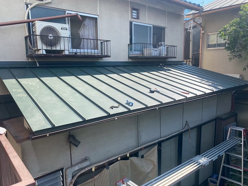 既存はウレタン塗膜防水でしたが、勾配を活かして立平葺で施工させていただきました。